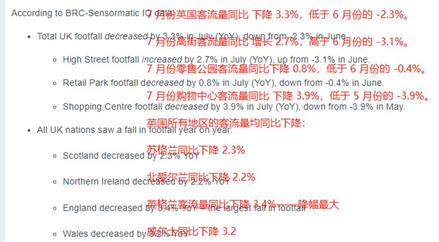 具體來看,7月,英國街道客流量同比增長了2.7%,但零售公園的客流量同比下降了0.8%,降幅大于6月份的0.4%。與此同時,該月英國購物中心的客流量同比下降最為明顯,降幅達到了3.9%。而從地區(qū)來看,7月英國蘇格蘭、北愛爾蘭、英格蘭和威爾士的客流量都出現(xiàn)了下降,降幅在2.2%—3.4%不等。