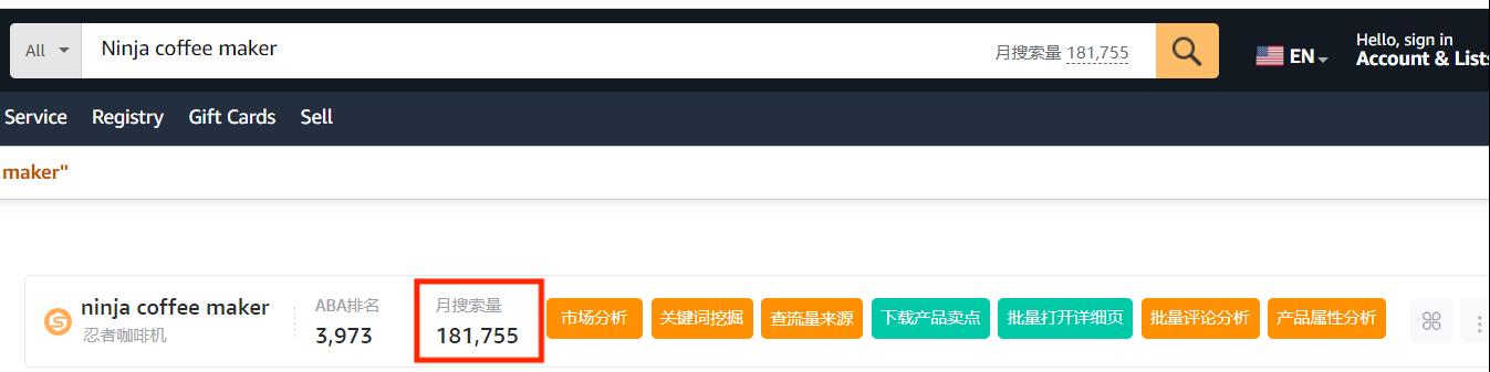 “Ninja coffee maker”關(guān)鍵詞亞馬遜搜索量達18萬次 圖源:SellerSprite?