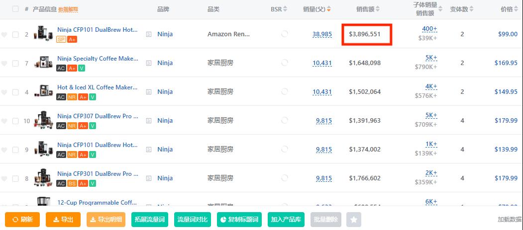 Ninja咖啡機單品月銷389.6萬美金 圖源:SellerSprite