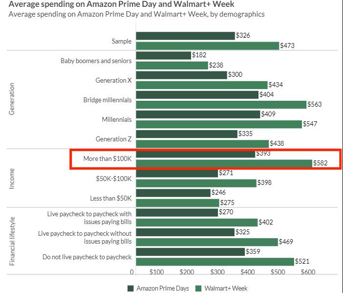 值得一提的是,盡管沃爾瑪會員周在獨有客戶比例方面與亞馬遜Prime Day持平,但在消費者支出方面,沃爾瑪會員周的平均支出要比亞馬遜Prime Day高出約45%。這種支出差距存在于各世代的消費群體中,尤其是年收入超過10萬美元的消費群體,這種支出差異最大。這意味著,在吸引高消費群體方面,沃爾瑪?shù)谋憩F(xiàn)要明顯優(yōu)于亞馬遜。