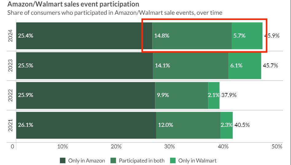最近,全球分析公司PYMNTS發(fā)布了一項關(guān)于沃爾瑪會員周與亞馬遜Prime Day業(yè)績表現(xiàn)對比的研究報告,結(jié)果顯示,盡管亞馬遜Prime Day在購物者數(shù)量方面仍保持較大的優(yōu)勢,但就會員參與率而言,沃爾瑪正在縮小與亞馬遜之間的差距。