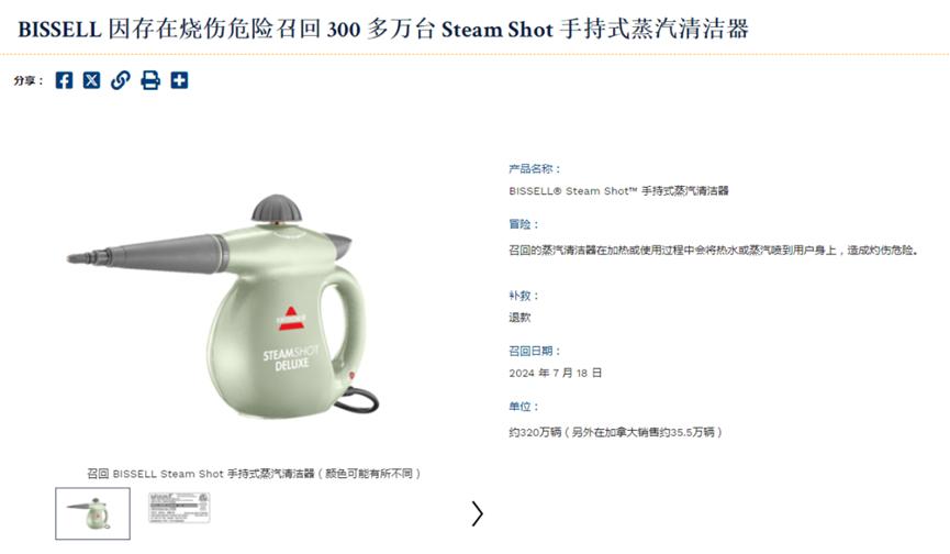 今年7月底,BISSELL旗下一款蒸汽清潔器被CPSC點名召回。據(jù)悉,這款產(chǎn)品在亞馬遜、沃爾瑪、Target等多個平臺上出售,售價在35—40美元,截止到今年5月已經(jīng)售出了總共320萬件。之所以會被召回,是因為該產(chǎn)品存在漏出熱水或蒸汽的問題,已經(jīng)導致了183起事故,致使多名消費者在使用過程中受傷。