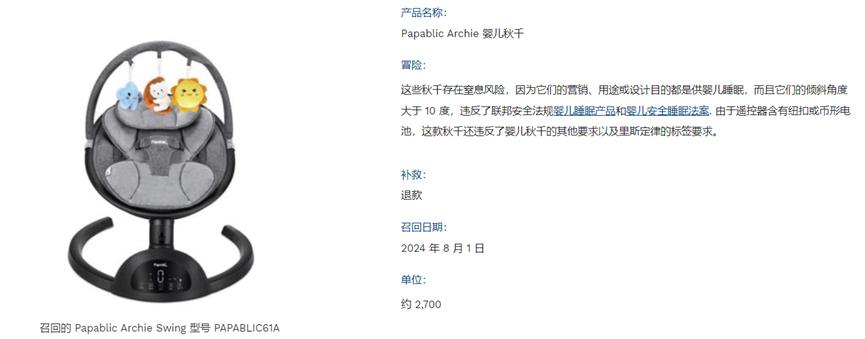 事實上,除了上文提到的Papablic Archie嬰兒秋千,CPSC近來還緊急召回了多款存在安全風險的產(chǎn)品。