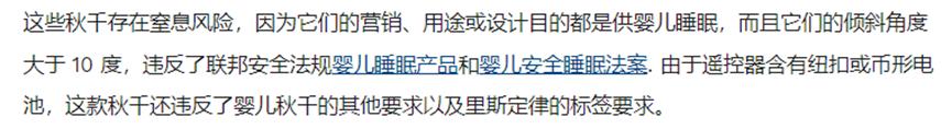 對于這款產(chǎn)品被召回的原因,CPSC做了詳細敘述。首先,這款產(chǎn)品的主要用途是供嬰兒睡眠,但它的傾斜角度大于10度,可能會導致嬰兒窒息,違反了聯(lián)邦安全法規(guī)嬰兒睡眠產(chǎn)品和嬰兒安全睡眠法案。其次,這款產(chǎn)品配備的遙控器中含有紐扣電池,違反了有關(guān)嬰兒秋千的其他一些安全要求。