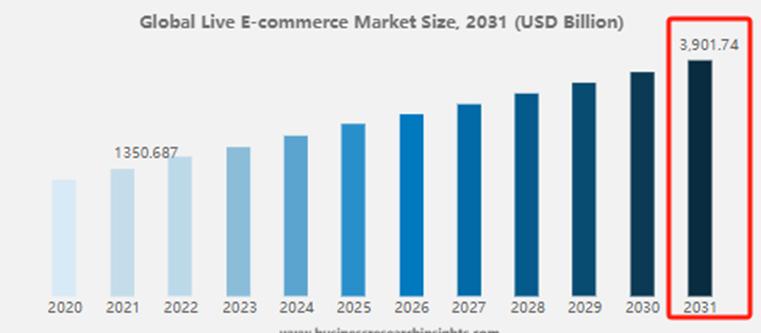 據(jù)Statista提供的數(shù)據(jù),2023年美國(guó)直播電商銷售額大約為500億美元,預(yù)計(jì)未來(lái)三年將持續(xù)增長(zhǎng)36%。而Business Research的數(shù)據(jù)則指出,到2031年全球直播電商市場(chǎng)規(guī)模預(yù)計(jì)將達(dá)到39017.4億美元,2021年-2031年復(fù)合年增長(zhǎng)率大概為11.28%。