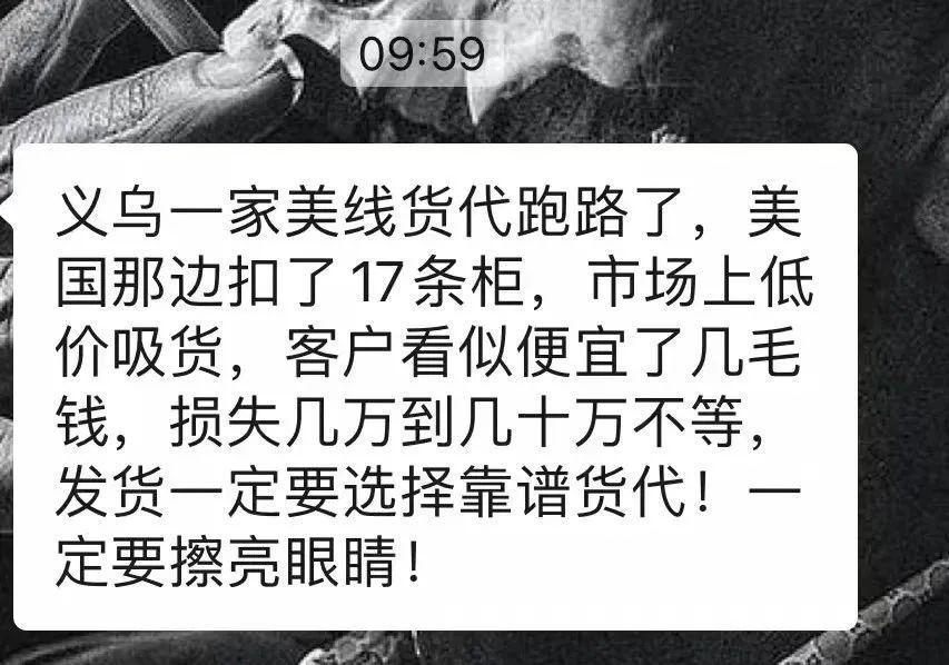 就在最近,一家位于義烏的美線貨代突遭變故。據(jù)了解,事情起因是該公司在美國(guó)遇到查驗(yàn),導(dǎo)致價(jià)值2億元的貨柜被扣,直接牽連眾多賣家及貨代。然而,等貨主上門尋求解決辦法時(shí),卻發(fā)現(xiàn)負(fù)責(zé)人已經(jīng)卷款跑路(金額高達(dá)1400萬(wàn)元)。