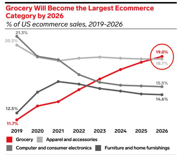 其實(shí),沃爾瑪?shù)倪@一成績不僅彰顯了沃爾瑪在電子商務(wù)領(lǐng)域的深厚底蘊(yùn),也反映了美國在線雜貨市場的蓬勃發(fā)展和巨大潛力。來自eMarketer的數(shù)據(jù)顯示,到2026年,在線雜貨銷售預(yù)計(jì)將占據(jù)美國電商總銷售額的19%,超越服裝和配飾。Verified Market Research也預(yù)測,2030年,美國在線雜貨市場規(guī)模將達(dá)到599.4億美元,復(fù)合年增長率高達(dá)9.31%。