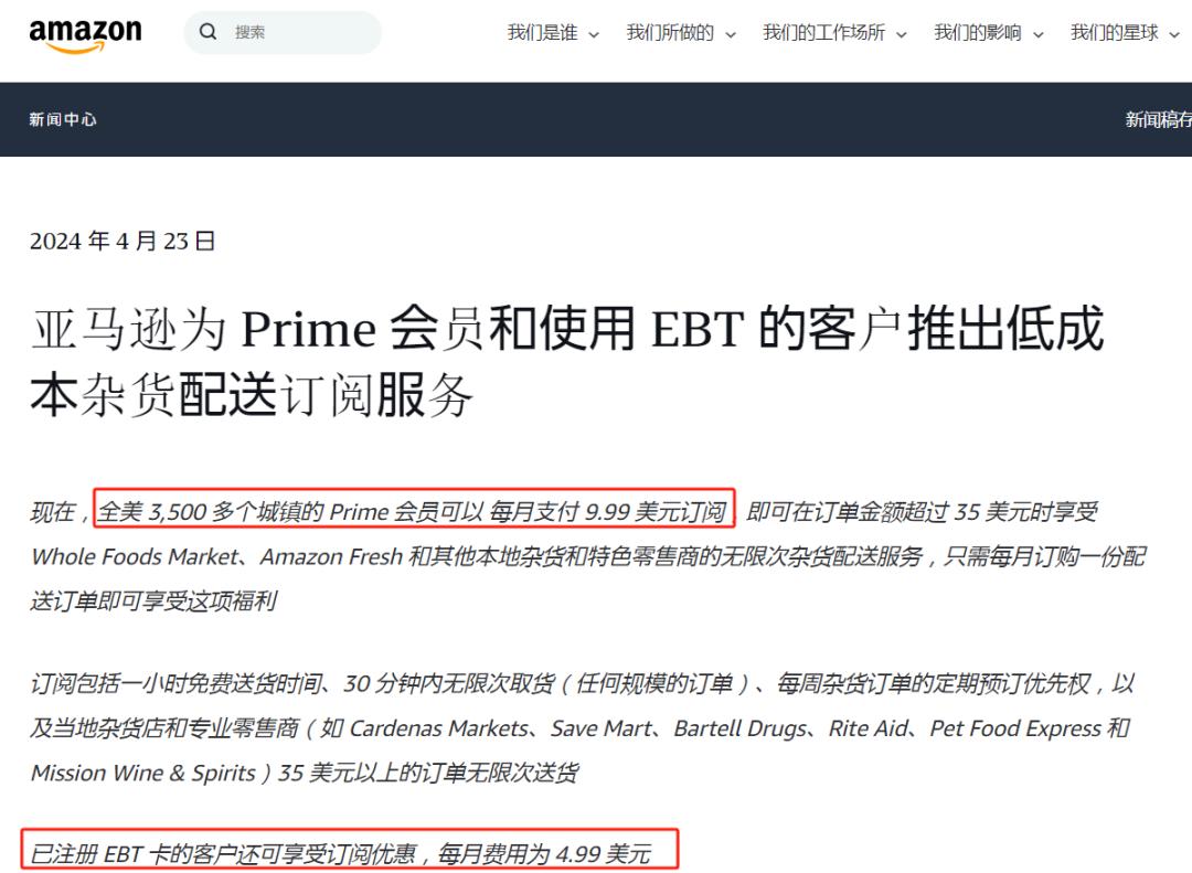 今年4月份,亞馬遜就針對Prime會員和EBT卡持有者推出了一項(xiàng)9.99美元雜貨配送服務(wù)。對于Prime會員,他們每個月花費(fèi)9.99美元就可以享受在Amazon fresh購買商品超過35美元的免費(fèi)配送到家服務(wù);對于EBT卡持有者,這項(xiàng)花費(fèi)還更少,僅需4.99美元就能享受到相應(yīng)服務(wù)。