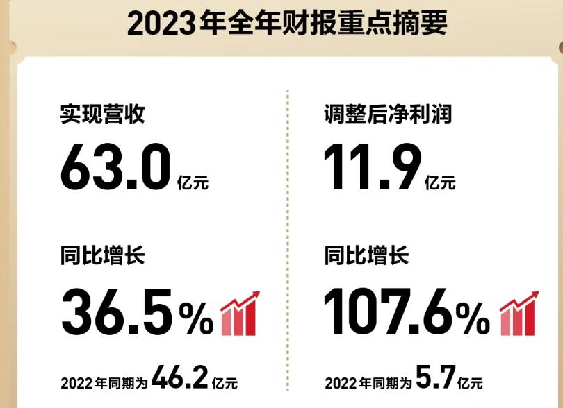 根據(jù)泡泡瑪特發(fā)布的2023年度業(yè)績單,數(shù)據(jù)顯示,2023年公司收入和利潤均創(chuàng)下了歷史新高,實現(xiàn)營收63億元,同比增長了36.5%;調整后凈利潤為11.9億元,同比增長107.6%。其中,港澳臺及海外收入達到了10.66%,同比暴漲134.9%,占總收入的16.9%。