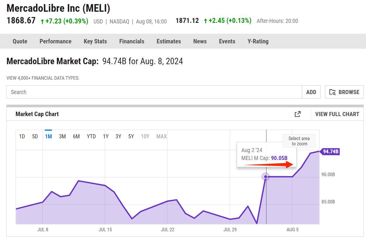 近日,巴西咨詢公司Elos Ayta Consultoria發(fā)布了一項最新的拉丁美洲上市企業(yè)調(diào)查報告,結(jié)果顯示,美客多在8月2日的股價表現(xiàn)十分強勁,當日紐約收盤價鎖定在1776.14美元,單日漲幅高達10.59%,總市值飆升至900.4億美元,一舉超越巴西國家石油公司,成為拉丁美洲最值錢的企業(yè)。