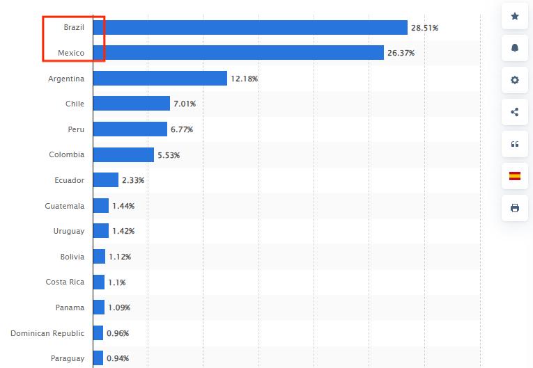 巴西和墨西哥電商市場份額占比最大 圖源:Statista