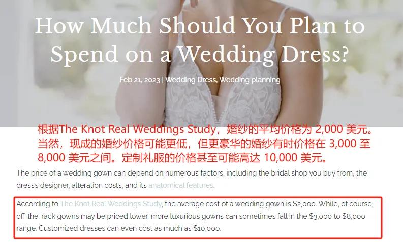 根據(jù)The Knot Real Weddings研究,一件婚紗的平均價格為2000美元,更豪華的禮服可能要花費(fèi)5000美元以上,而定制禮服則需10000美元。但很多人并不愿意花費(fèi)過多預(yù)算購買一件只穿一次的禮服,再加上從婚前派對到婚禮和蜜月等活動,都是一筆很大的開銷。