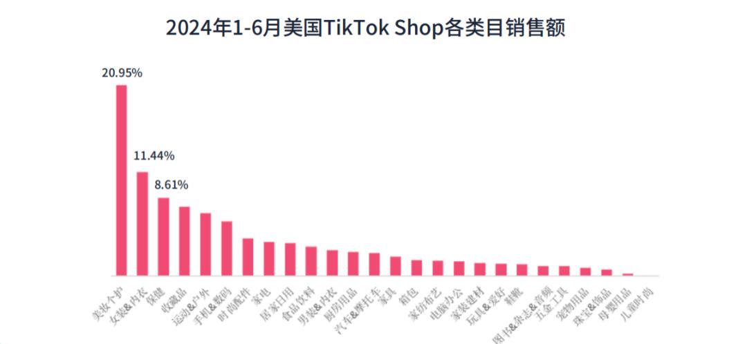 在美妝市場(chǎng)最為成熟的美國(guó),TikTok的影響力更是非同凡響。根據(jù)FastMoss最新發(fā)布的《2024年半年度TikTok生態(tài)發(fā)展白皮書》,2024年上半年,美妝個(gè)護(hù)品類穩(wěn)居TikTok美區(qū)第一大熱門品類,占據(jù)平臺(tái)商品銷售總額的20.95%,遙遙領(lǐng)先排名第二的女裝及內(nèi)衣品類(11.44%)。