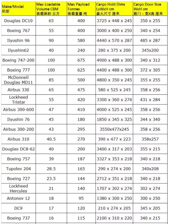 最后再給大家分享一下現(xiàn)在國際空運常用的全貨機的相關(guān)型號規(guī)格,共大家日后工作需要。
