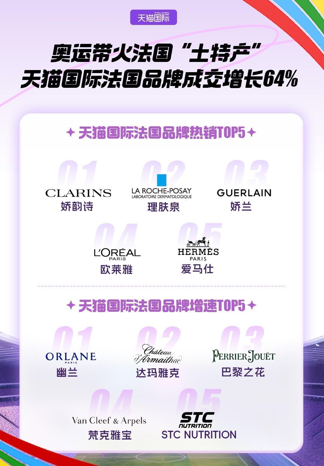 除了中國消費(fèi)者熟悉的國際大牌,來自法國的新品牌在奧運(yùn)期間也迎來強(qiáng)勁增長。去年6月入駐天貓國際的法國貴族護(hù)膚品牌ORLANE幽蘭,成交相比去年同期漲超300倍,干紅葡萄酒品牌Chateau d’Armailhac達(dá)瑪雅克,成交同比增長200倍,香檳酒品牌Perrier-Jouet巴黎之花成交增長70倍。