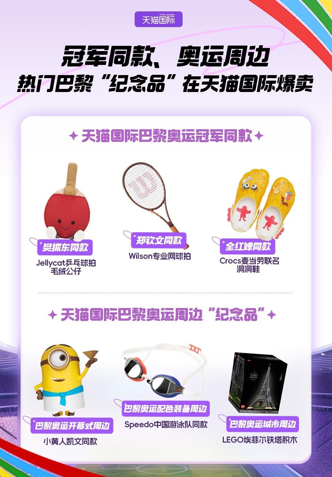 8月10日消息,天貓國際數(shù)據(jù)顯示,過去兩周,巴黎奧運(yùn)冠軍同款商品銷售火爆。鄭欽文同款Wilson PRO STAFF V14網(wǎng)球拍在天貓國際搜索量環(huán)比增長400倍,成交增長405%,全紅嬋同款Crocs麥當(dāng)勞聯(lián)名款洞洞鞋搜索量環(huán)比增長56倍,樊振東同款Jellycat乒乓球拍毛絨公仔成交增長1425%。
