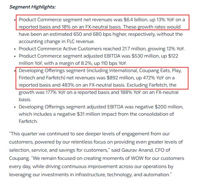 分業(yè)務(wù)來看,Coupang產(chǎn)品商務(wù)部門凈收入為64億美元,同比增長13%,調(diào)整后EBITDA為5.3億美元,利潤率8.2%;發(fā)展產(chǎn)品部門(包括國際業(yè)務(wù)、Coupang Eats、Play、金融科技和Farfetch)凈收入為8.92億美元,同比增長472%,不計(jì)入Farfetch則同比增長177%,調(diào)整后的EBITDA為-2億美元,其中包括合并Farfetch帶來的3100萬美元的負(fù)影響。