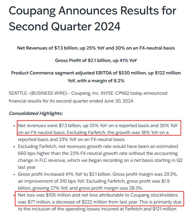 8月7日消息,韓國電商巨頭Coupang公布2024年第二季度財報。二季度,Coupang凈收入為73億美元,同比增長25%;毛利潤21億美元,同比增長41%,毛利率為29.3%,同比提高310個基點(diǎn);凈虧損1.05億美元,歸屬于股東的凈虧損為7700萬美元,較去年減少2.22億美元,主要由于計(jì)入了Farfetch的經(jīng)營虧損和與韓國公平貿(mào)易委員會估計(jì)行政罰款相關(guān)的1.21億美元。除去Farfetch的損失和行政罰款,歸屬于Coupang股東的凈利潤約為1.24億美元。