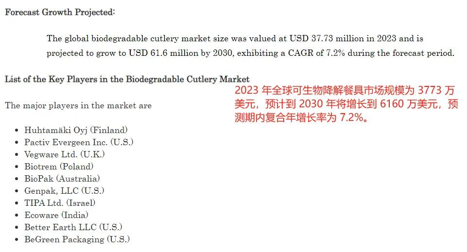 Fortune Business Insights的數(shù)據(jù)顯示,2023年全球可生物降解餐具市場(chǎng)規(guī)模為3773萬(wàn)美元,預(yù)計(jì)到2030年將增長(zhǎng)到6160萬(wàn)美元,預(yù)測(cè)期內(nèi)復(fù)合年增長(zhǎng)率為7.2%。在這個(gè)獨(dú)具一格的賽道上,主要玩家有Biotrem、Vegware Ltd、Pactiv Evergeen Inc.等。