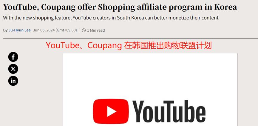 Coupang與YouTube合作推出購物聯(lián)盟計劃 圖源:kedglobal