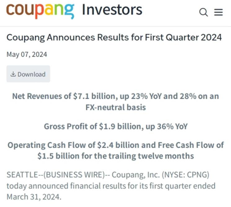 官方財報顯示,2023年第四季度,Coupang達成了10億美元的凈利潤。2023年全年,Coupang營收達到了244億美元,不僅相較上一年增長了20%,還超出了分析師的預(yù)期,同時該年度也是Coupang首個盈利年度。今年第一季度,Coupang的業(yè)績繼續(xù)增長,凈收入同比增長23%達到71億美元,且連續(xù)第7個季度實現(xiàn)盈利。