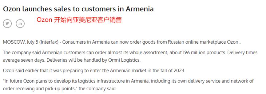 2023年7月,Ozon再下一城,宣布已經(jīng)成功進(jìn)入亞美尼亞市場(chǎng),對(duì)此獨(dú)聯(lián)體Ozon運(yùn)營(yíng)和開(kāi)發(fā)總監(jiān)Alexei Sapon表示,“我們希望加強(qiáng)我們?cè)谠搰?guó)的基礎(chǔ)設(shè)施,以便即使是亞美尼亞最偏遠(yuǎn)角落的居民也可以在線訂購(gòu)到想要的產(chǎn)品?!?/span>
