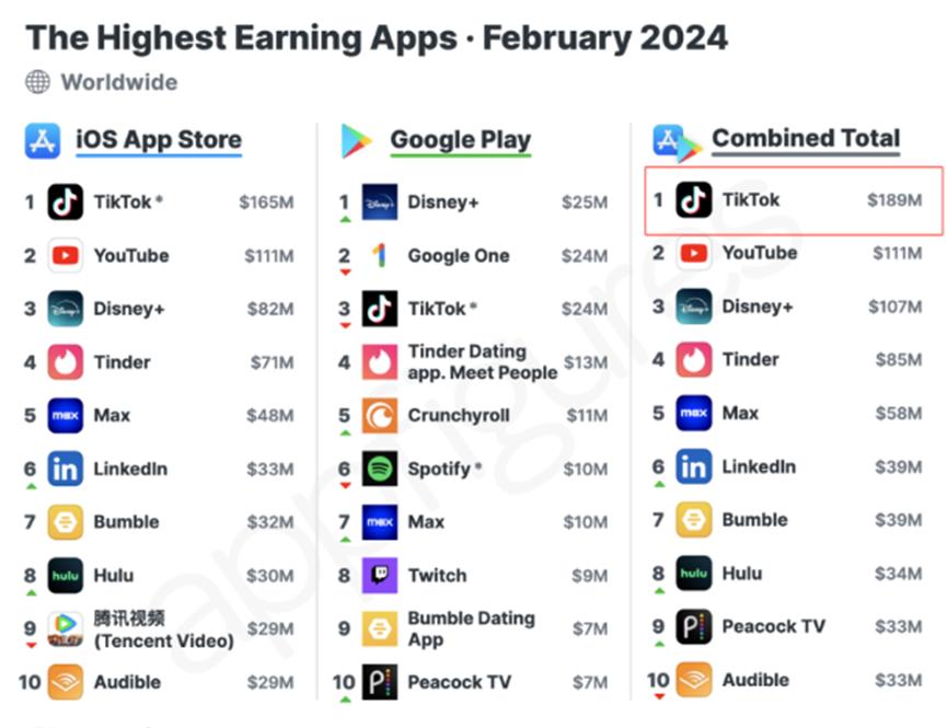 研究表明,有74%的Z世代用戶會使用TikTok搜索商品,并且這些消費者在TikTok看上某樣商品后會產(chǎn)生購買欲望。而Appfigures公布的全球應用程序收入排行榜則指出,今年2月份,TikTok憑借1.89億美元的成績成為全球收入最高的應用程序,其吸金能力可見一斑。