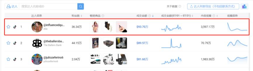 數(shù)據(jù)顯示,7月份TikTok達人總體帶貨趨勢為增長,其中來自美國的Alle(@influencedqueens)表現(xiàn)最佳。過去一個月中,這位美國姑娘在TikTok的帶貨金額接近100萬美金,內(nèi)容觀看次數(shù)達到3597.17次,而她賬號的粉絲數(shù)量也才36.34萬,這意味著其內(nèi)容具有廣泛吸引力,不僅限于粉絲內(nèi)部,且在流量變現(xiàn)方面也是潛力巨大。