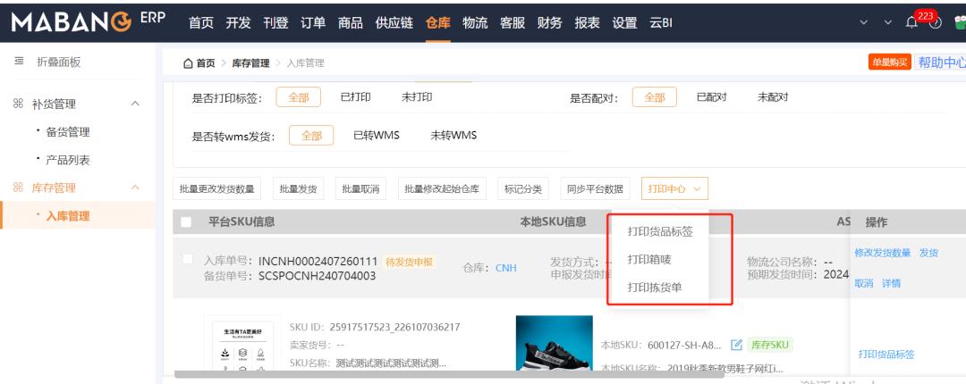 在發(fā)貨環(huán)節(jié),馬幫ERP能夠根據(jù)訂單信息自動(dòng)生成并打印出符合規(guī)范的貨品標(biāo)簽、箱嘜以及揀貨單,不僅大大提高了工作效率,減少了人為錯(cuò)誤,還提升了包裹處理的準(zhǔn)確性和速度。