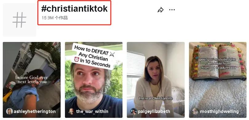 隨著近些年基督教在全球范圍內(nèi)的影響力不斷提升,越來越多的人開始以TikTok作為社區(qū)交流媒介。在TikTok上搜索標(biāo)簽“#christiantiktok”,共出現(xiàn)1590萬個(gè)產(chǎn)品,視頻類型包括經(jīng)文祈禱打卡、信徒日常生活記錄等,用戶群體逐漸龐大。