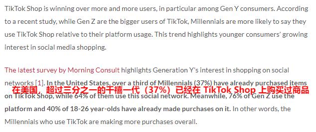 國際信息咨詢公司Morning Consult的數(shù)據(jù)指出,高達(dá)64%的千禧一代和76%的Z世代用戶已經(jīng)活躍于TikTok Shop,其中,40%的Z世代用戶已經(jīng)在TikTok Shop上購買過商品,緊隨其后的是千禧一代,占比達(dá)到37%。