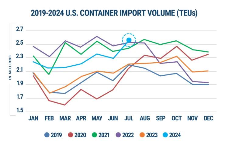 受港口運力下降、工人潛在罷工、地緣沖突等因素影響,為了應(yīng)對下半年的假日購物季,美國零售商掀起了進口熱潮。一時間,集裝箱進口量暴漲。