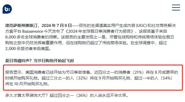 Bazaarvoice發(fā)布的《2024 年全球假日季消費者行為報告》顯示,美國消費者已經(jīng)開始積極準備迎接假日購物季,21%的受訪者表示將在8月或更早開始購買禮物,32%的受訪者將在9月份開始購買,而54%的受訪者將在10月份開始購物。