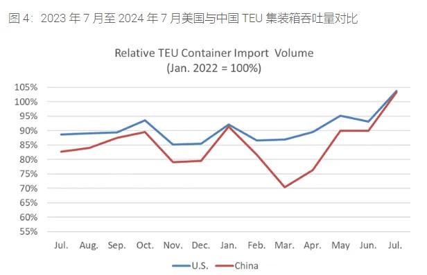 7月集裝箱進口量強勁增長,很大一部分原因是來自中國的進口量創(chuàng)下歷史新高。報告強調(diào),美國7月從中國進口量較今年6月環(huán)比增長14.7%、較去年7月同比增長25%,達到驚人的102.3TEU,排名前列的商品是家具、床上用品、塑料及其制品等。