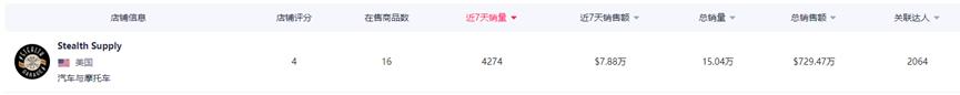 根據(jù)FastMoss提供的數(shù)據(jù),最近一周,Stealth Supply小店的總銷量為4274件,銷售額將近8萬(wàn)美元(7.88萬(wàn)美元)。截止目前,該品牌在TikTok Shop總共售出了15萬(wàn)件商品,總銷售額也達(dá)到了驚人的729.47萬(wàn)美元。