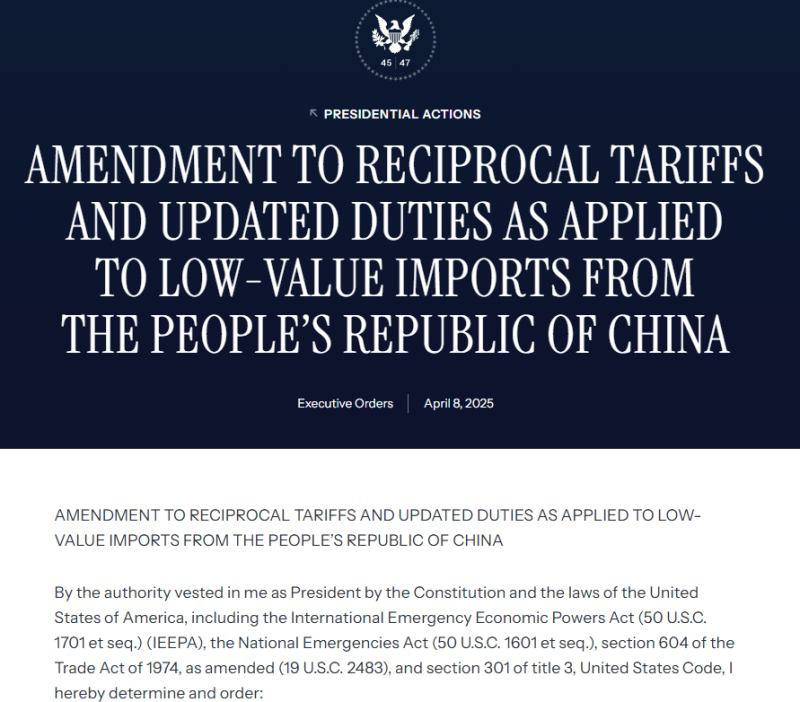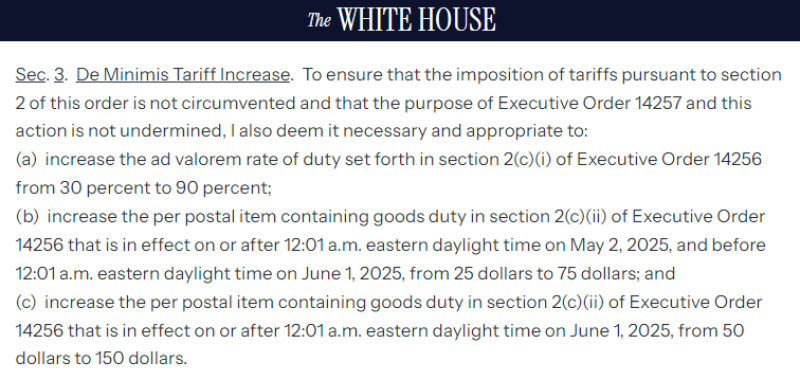 同時,特朗普對中國出口的價值800美元或以下商品“小額免稅”政策做出最新調(diào)整:1、從價關(guān)稅稅率從30%提高到90%;2、美國東部夏令時間5月2日-6月1日,每件小額包裹的關(guān)稅從25美元提高到75美元。6月1日后,每件小額包裹的關(guān)稅從50美元提高到150美元。