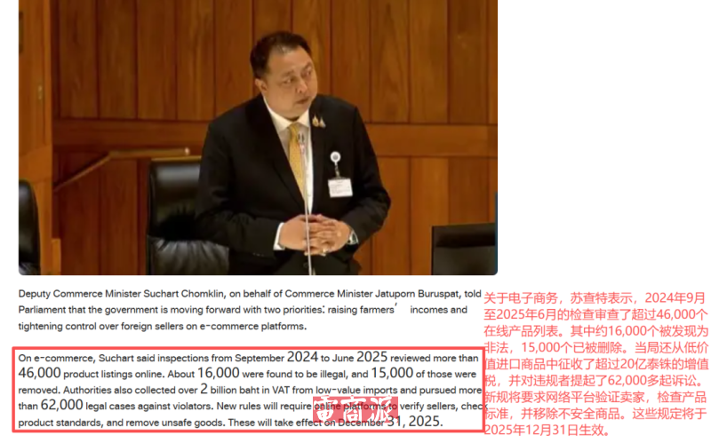 泰國商務(wù)部副部長蘇查·瓊克林表示,在2024年9月至2025年6月期間,泰國當(dāng)局檢查了超過46000個(gè)在線商品,發(fā)現(xiàn)約16000個(gè)為非法商品,這是非??鋸?bào)@人的比例,不僅損害了消費(fèi)者的權(quán)益,也對泰國本土合法商家的利益造成了沖擊。