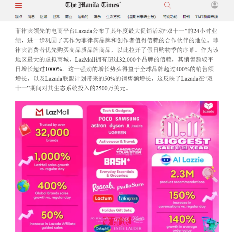 11月14日消息,Lazada今年11.11購物節(jié)全面刷新銷售紀(jì)錄,LazMall在多個(gè)東南亞市場的首日銷售額均較平日增長約10至11倍,電子產(chǎn)品、美妝、母嬰等核心品類成為主要增長動(dòng)力。