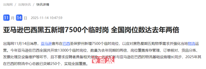 亞馬遜巴西新增7500個臨時崗位應(yīng)對黑五大促