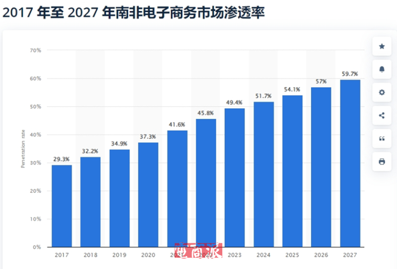 更重要的是,隨著互聯(lián)網(wǎng)的普及和電商平臺(tái)的涌現(xiàn),南非電商市場(chǎng)正在經(jīng)歷快速增長(zhǎng)。很早之前Statista發(fā)布的一份報(bào)告就指出,預(yù)計(jì)2023年至2027年間,南非電商市場(chǎng)的滲透率將增加10.3個(gè)百分點(diǎn),并在2027年達(dá)到59.7%的峰值。