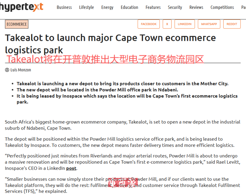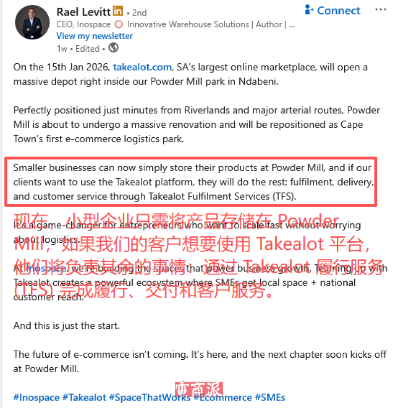 對(duì)此,Inospace首席執(zhí)行官Rael Levitt在LinkedIn帖子中表示:“現(xiàn)在,小型企業(yè)只需將產(chǎn)品存儲(chǔ)在 Powder Mill,如果我們的客戶(hù)想要使用 Takealot 平臺(tái),他們將負(fù)責(zé)其余的事情:通過(guò)Takealot 履行服務(wù) (TFS) 完成履行、交付和客戶(hù)服務(wù)?!焙?jiǎn)單來(lái)說(shuō),這一合作模式將顯著降低中小企業(yè)的物流門(mén)檻。