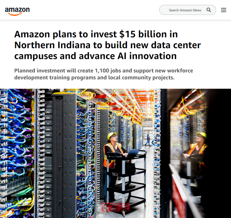 同日,亞馬遜宣布,計(jì)劃在美國(guó)印第安納州北部投資150億美元,用于建設(shè)新的數(shù)據(jù)中心園區(qū),并推進(jìn)人工智能創(chuàng)新。這一新項(xiàng)目將為該地區(qū)增加2.4吉瓦的數(shù)據(jù)中心容量,創(chuàng)造1100個(gè)就業(yè)崗位,并帶動(dòng)數(shù)據(jù)中心供應(yīng)鏈數(shù)千個(gè)就業(yè)機(jī)會(huì)。與NIPSCO達(dá)成的能源協(xié)議將改善當(dāng)?shù)鼐用穹?wù),預(yù)計(jì)未來(lái)15年為印第安納州現(xiàn)有居民和企業(yè)節(jié)省約10億美元成本。