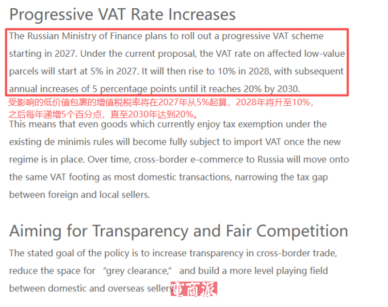 同時(shí)俄羅斯財(cái)政部還計(jì)劃道,自2027年起實(shí)施漸進(jìn)式加稅方案:起始稅率為5%,2028年提高至10%,之后每年上調(diào)5個(gè)百分點(diǎn),至2030年達(dá)到20%。即便目前享受免稅的商品,屆時(shí)也須預(yù)扣增值稅。