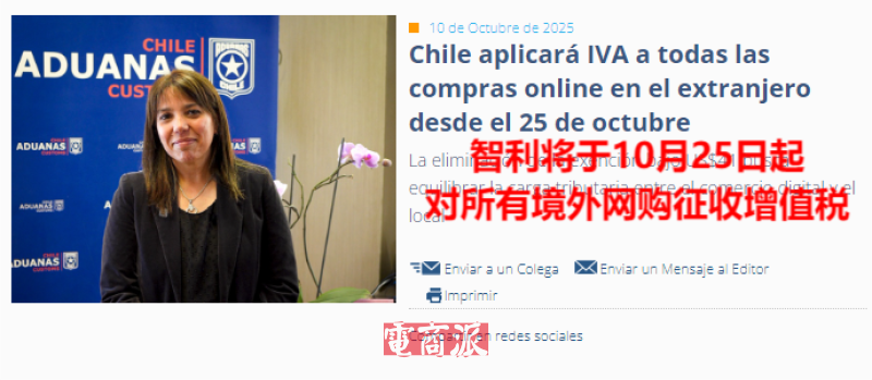 再早些時(shí)候,智利國(guó)稅局(SII)也宣布,從10月25日起取消41美元以下的進(jìn)口商品增值稅豁免,所有通過(guò)電商平臺(tái)銷(xiāo)售的境外商品需繳納19%的增值稅。