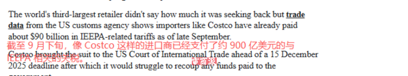 盡管開市客并沒有透露涉案稅款的具體金額,但依據(jù)美國海關機構(gòu)此前發(fā)布的貿(mào)易數(shù)據(jù),截至今年9月下旬,像開市客這樣的進口商已經(jīng)支付了約900億美元(約合人民幣6363億元)與IEEPA相關的稅款。